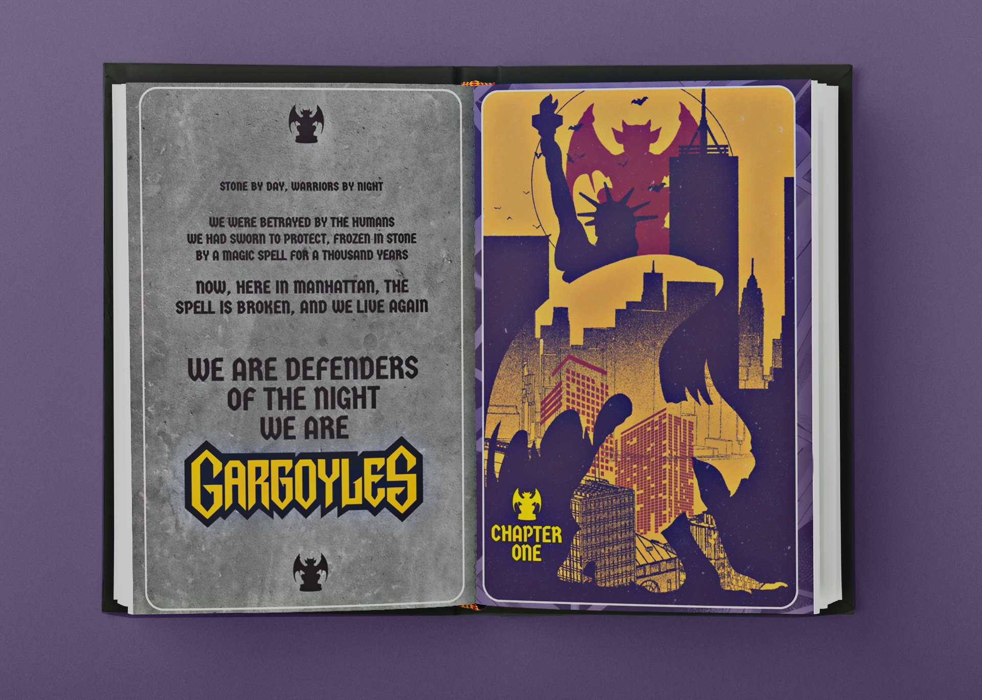 I drew inspiration from New York’s architecture, incorporating a building silhouette on the spine, layering cityscapes behind the artwork, and evoking the show’s brooding nightscapes with gritty stone textures. The color palette, adapted from the existing brand identity, ensured consistency while complementing the mood. I extended these design choices throughout the deluxe edition, enhancing the interview with Greg Weisman and creating thematic chapter openers accented with decorative flourishes that reinforced the Gargoyles’ atmospheric world.